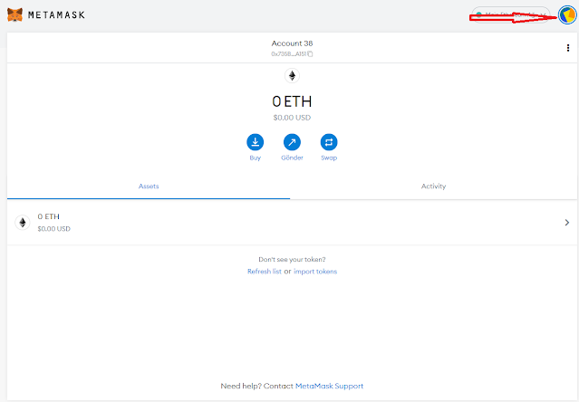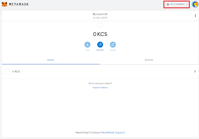 - Gördüğünüz gibi yukardaki metamask ağlar kısmında KCC Mainnet ağı gözüküyor. Eğer diğer ağlara geçek isterseniz işaretli kısımdan ekli olan ağlara geçiş yapabilirsiniz.
